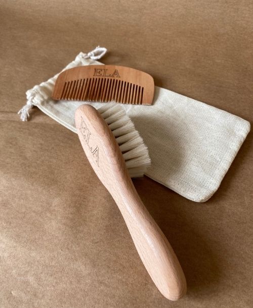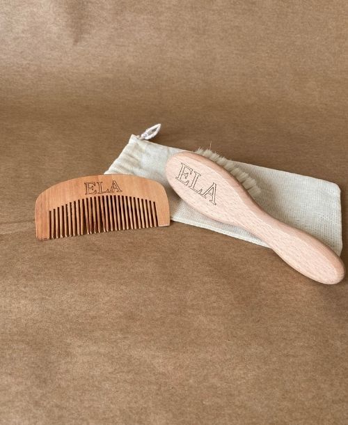 İsme özel olarak tasarlanan bu %100 keçi kılı bebek saç fırçası ve doğal ahşap mini oval tarak seti, bebeğinizin hassas saç derisine nazikçe bakım yapmanız için idealdir.