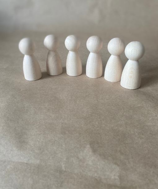 Tiny Wood 6’lı Ahşap Peg Bebek Seti, tamamen doğal ıhlamur ağacından üretilmiştir.