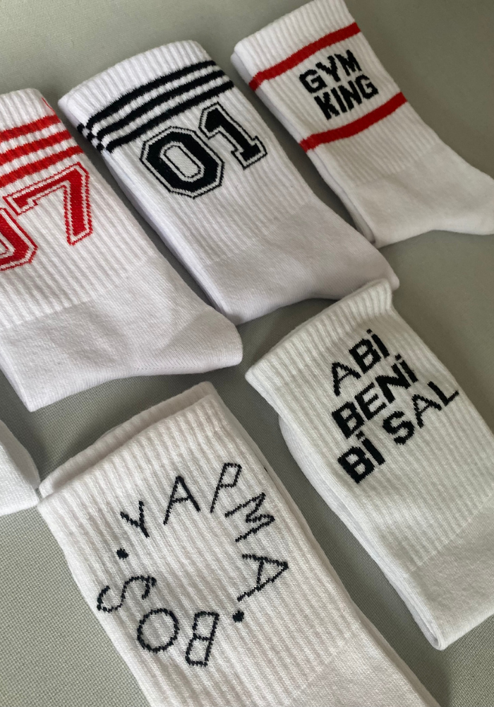 Modern çizgili ve yazı detaylı tasarımlarıyla dikkat çeken bu çorap seti, hem spor salonunda hem de günlük kullanımda rahatlık sağlar.