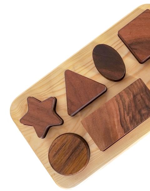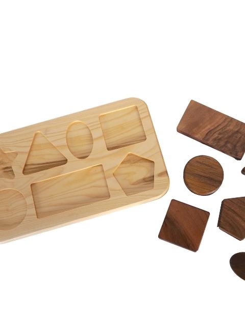 Set, 7 adet doğal ceviz ağacından geometrik şekil ve 1 adet ıhlamur ağacından yapılmış yerleştirme tablası olmak üzere toplam 8 parçadan oluşur.