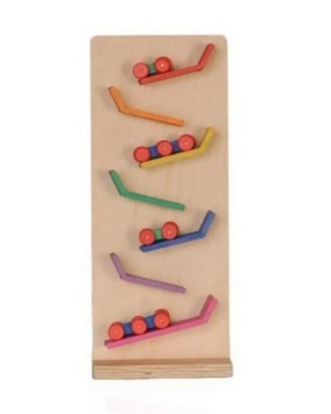 Ahşap standın üzerinde yer alan 7 farklı renkli kaydırak sayesinde arabalar yukarıdan bırakıldığında eğlenceli bir şekilde aşağıya doğru kayar.