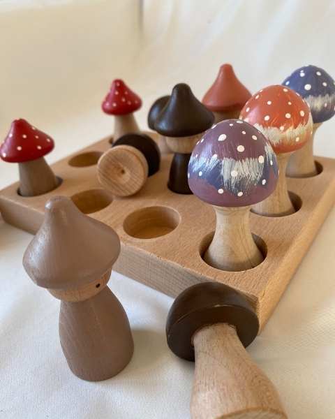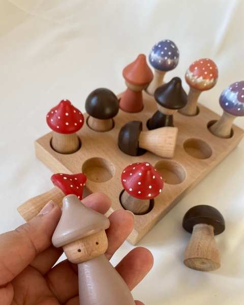 Tiny Wood Ahşap Mantar Toplama Montessori Oyuncağı, çocukların el-göz koordinasyonunu, ince motor becerilerini ve dikkat gelişimini desteklemek için tasarlanmış doğal bir eğitim setidir.