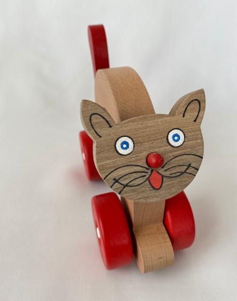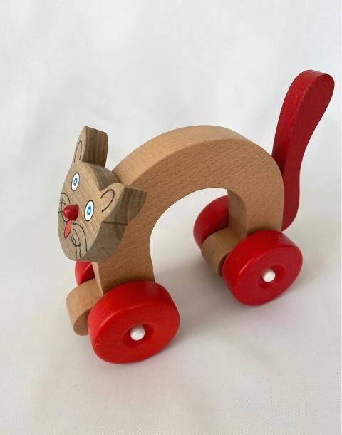 Kırmızı renkli tekerlekleriyle hareket ettirilebilen bu sevimli kedi, çocukların hayal gücünü, dikkat süresini ve denge becerilerini geliştirir.