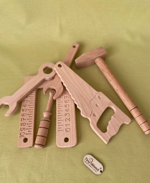 Ahşap Oyuncak Tamir Seti Doğal Masif Ahşap Oyuncak Montessori Oyuncak Her küçük detayı özen gösterilerek el yapımı ile hazırlanmış, ahşap tamir setimizi çok beğeneceksiniz. ; Minik ellerin kullanımına uygun olarak özel tasarlanmıştır. ; Bu ahşap tamir seti, minik hırdavatçılar için ideal bir oyuncak! Ahşap tamir setimiz doğal ahşaptan üretilmiş 7 parçadan oluşan alet takımıdır. ; Minik çocuklar için ekipmanlara benzetilmiş olup, çocuk el yapılarına uygun üretilmiştir. ; Tamir etmeye nereden başlayalım, şu minik sandalyeden mi? %100 El Yapımıdır Kayın ağacından özenle ve el emeği ile üretilen oyuncağımız. ; Oyuncağımızın kesme, zımparalama ve boyama dahil her aşaması el emeği ile yapılmaktadır. ; Ahşap oyuncaklarımız el yapımı olduğundan görsel olarak ufak farklılıklar (renk farklılıkları, ağaç budakları vb.) olabilir. ; MALZEME: Kayın ağacı YAŞ 1 YAŞ VE ÜZERİ Ölçü Testere 20 cm *7 cm*1 cm metre 16 cm *4 cmx 1 cm t cetvel 16x7 cm x1 cm vida sökücüler 16x5 cm x 1 cm çekiç 20 cm x 8 cm çap 1,5 cm kontrol kalemi 12 cm çap 2 cm;