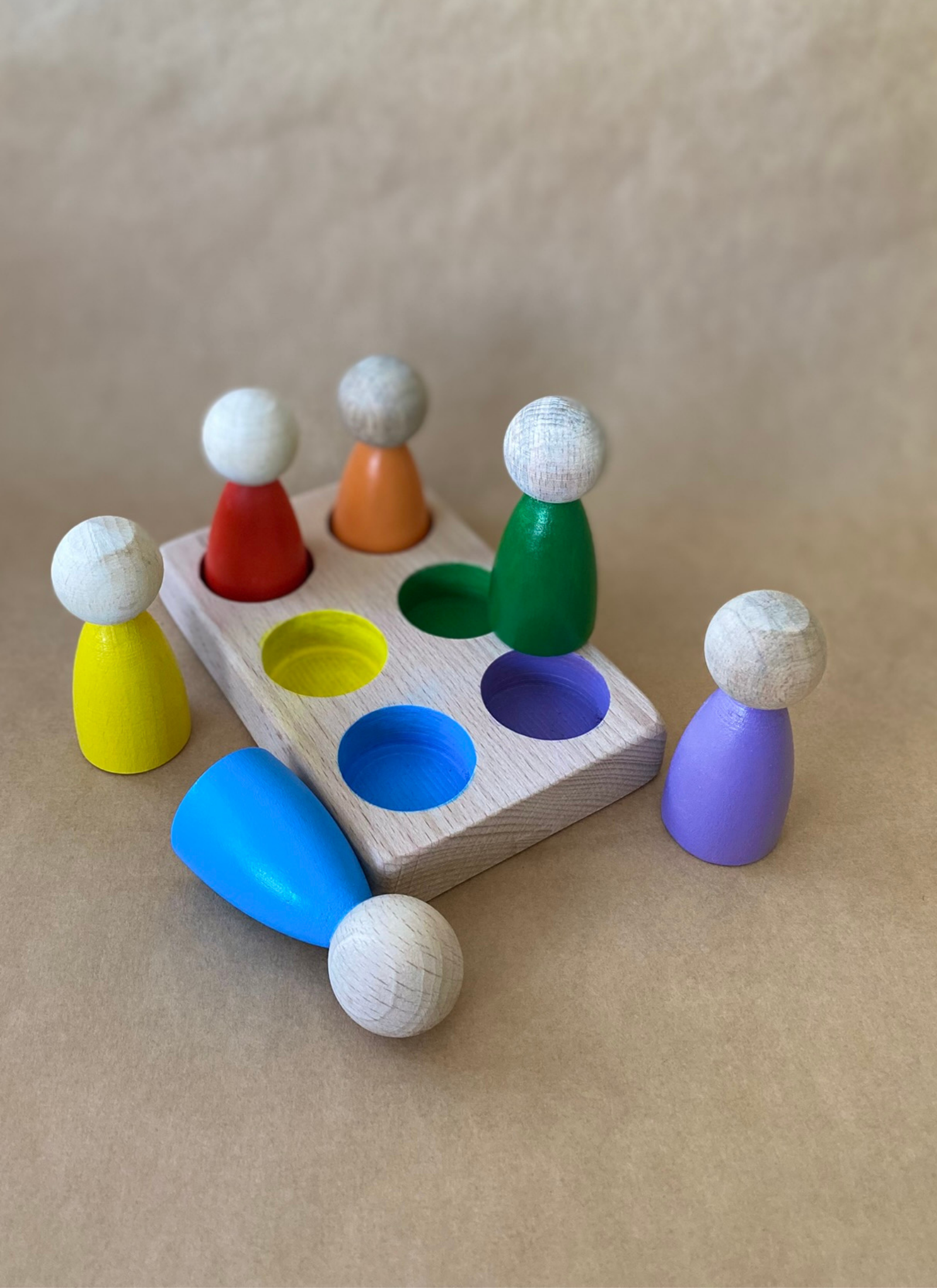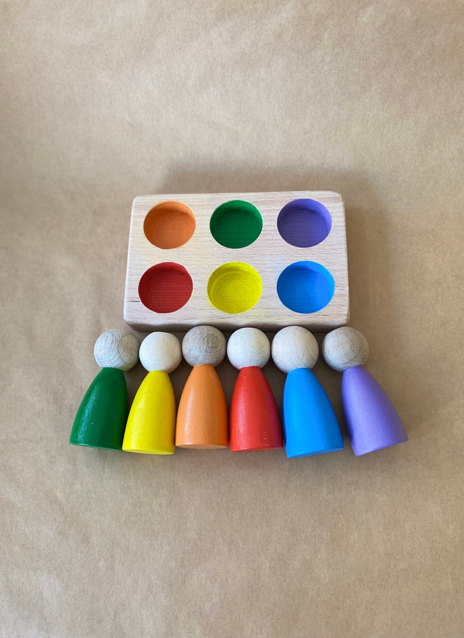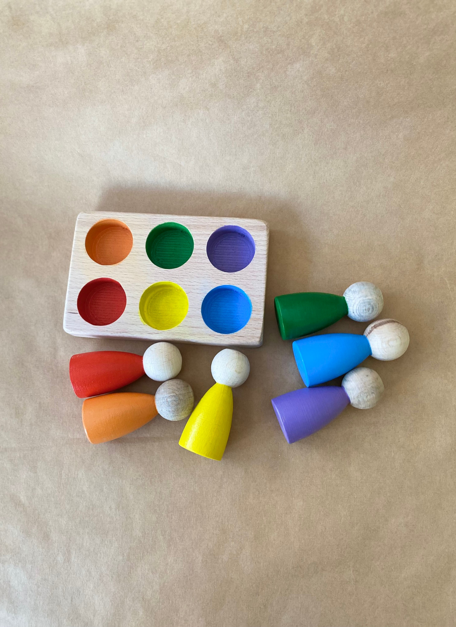 6’lı Peg Bebek Renk Eşleştirme Oyuncağı, çocukların renkleri tanımasını, eşleştirme yapmasını ve ince motor becerilerini geliştirmesini destekleyen Montessori uyumlu bir ahşap oyuncaktır.