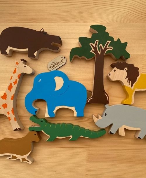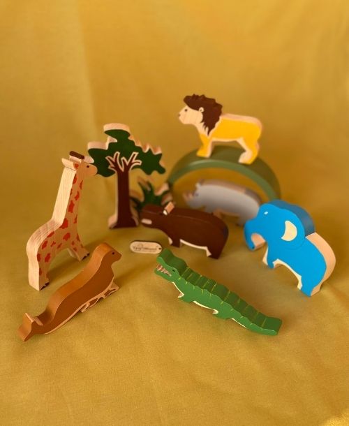 Ahşap Safari Hayvan Seti, çocukların doğa sevgisini ve hayal gücünü geliştiren, tamamen doğal malzemelerden üretilmiş açık uçlu bir Montessori oyuncağıdır.