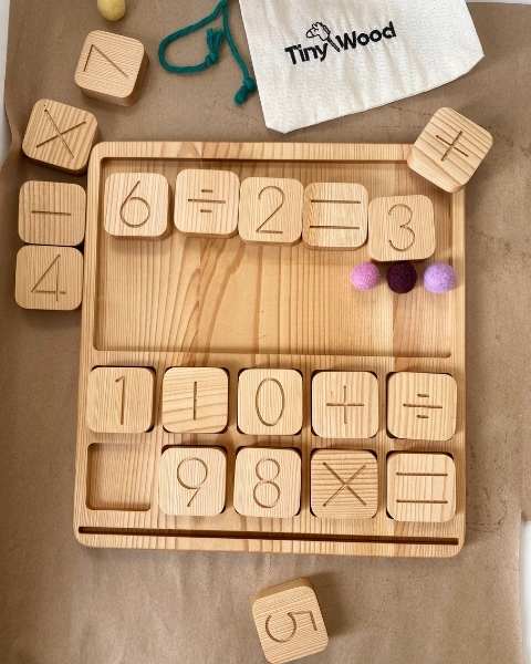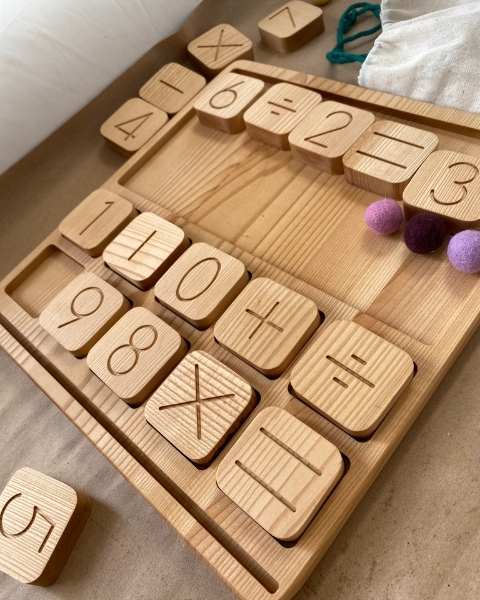 Çocuklar, tabloda yer alan yuvarlak ahşap topları kutucuklara yerleştirerek hem sayıları hem de temel matematik işlemlerini (toplama, çıkarma, çarpma, bölme) öğrenir.
