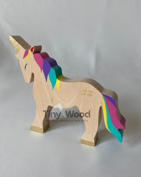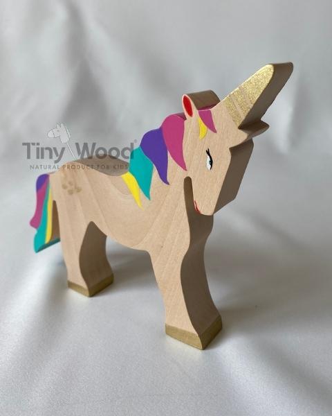 Gökkuşağının renkleriyle süslenmiş sihirli bir unicorn, çocukların hayal gücünü canlandırmak için Tiny Wood atölyesinde doğmuş.