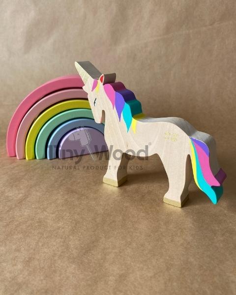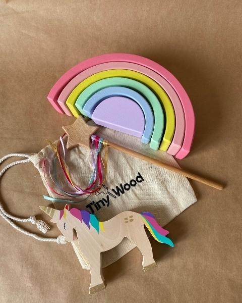Gökkuşağının renkleriyle süslenmiş sihirli bir dünyada yaşayan mutlu bir unicorn varmış. Her gün elindeki değnekle gökyüzüne renkler saçarmış. Tiny Wood’un el emeğiyle hazırladığı bu masalsı Waldorf seti, çocukların hayal gücünü canlandırmak için tasarlandı.