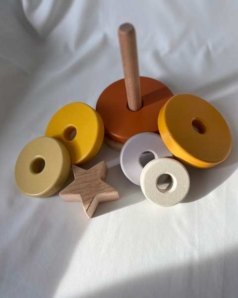 Minik ellerin kolayca kavrayabileceği şekilde üretilen bu ahşap kule, 6 adet halka ve 1 adet yıldızdan oluşur. Çocuklar halkaları büyükten küçüğe ya da karışık sıralarla dizerek dengeyi keşfeder, renk ve boyut ilişkilerini kavrar.