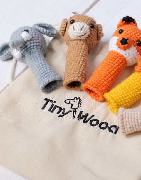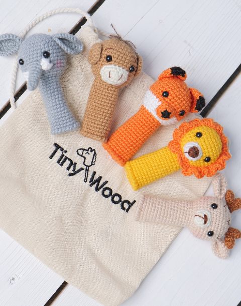 Tiny Wood Amigurumi Parmak Kukla Safari Seti, çocukların hayal gücünü, dil gelişimini ve iletişim becerilerini destekleyen tamamen el örgüsü bir oyun setidir.