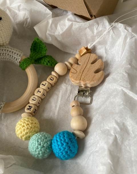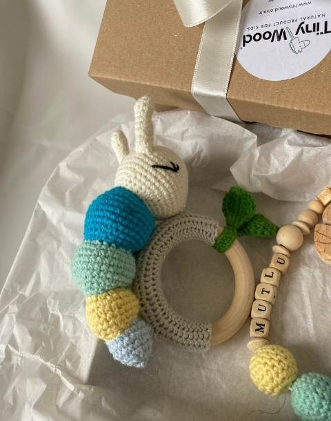 Amigurumi Sevimli Tırtıl Diş Kaşıyıcı Çıngırak ve İsimli Emzik Zinciri Seti