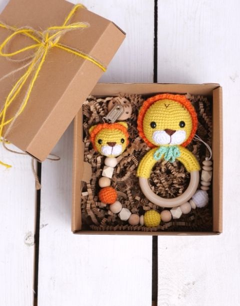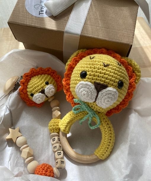 Aslan Çıngırak ve Emzik Zinciri Seti, bebekler için özel olarak tasarlanmış, organik ipliklerle el emeğiyle üretilmiş bir settir. Oeko-Tex sertifikalı bu ürünler, sağlığa zararlı hiçbir madde içermez. Set, bir adet aslan figürlü çıngırak ve bir adet emzik zincirinden oluşmaktadır. Çıngırak, aynı zamanda diş kaşıyıcı olarak kullanılabilir ve ses çıkarma özelliğiyle bebeğinizin dikkatini çeker. Emzik zinciri, bebeğinizin ismine özel olarak hazırlanabilir; bunun için sipariş sırasında not bölümünde belirtmeniz yeterlidir.