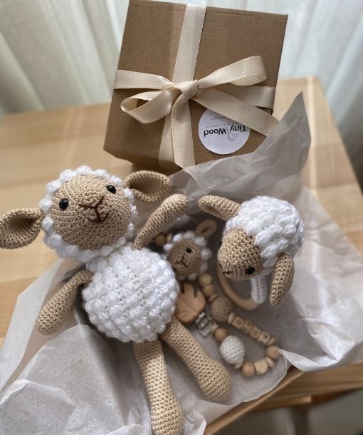 Tamamen el yapımı ve doğal malzemelerden üretilen bu özel set, yenidoğan bebekler için güvenli ve estetik bir hediye alternatifi sunar.