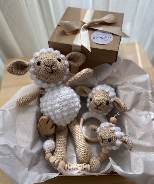 Kuzu Uyku Arkadaşı Bebek: %100 el yapımı, bebeklerin sarılıp uyuyabileceği yumuşak örgü oyuncak.