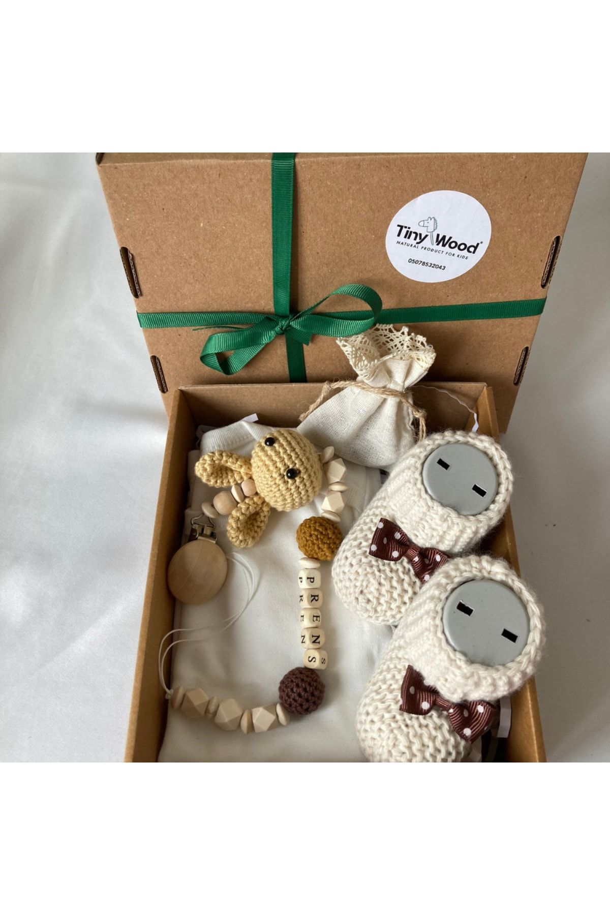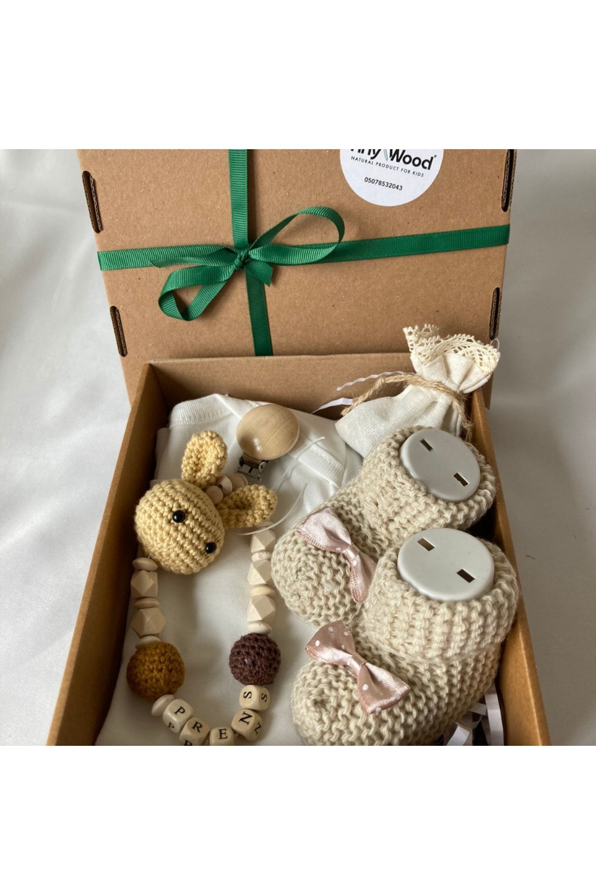 Hoşgeldin bebek, unisex, yenidoğan bebek hediye seti,ister kız ister erkek bebekler için bebek hediyelerimizi güvenle satın alabilirsiniz. Organik pamuk ve doğal ahşap ürünleri sizler için özenli bir şekilde bir araya getirip şirin bir bebek hediye kutusu haline getirdik. Paket içinde 1 çift triko patik, 1 adet isme özel emzik zinciri, 1 adet bebek çıtçıtlı body tshirt, 1 Aadet bez kesede lavanta Tekstil Ürünlerimiz %100 pamuk olup, alerjen madde içermemektedir.