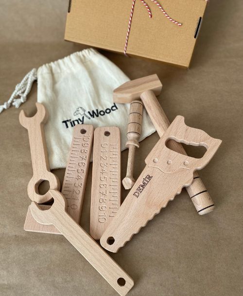 Ahşap Oyuncak Tamir Seti Doğal Masif Ahşap Oyuncak Montessori Oyuncak Her küçük detayı özen gösterilerek el yapımı ile hazırlanmış, ahşap tamir setimizi çok beğeneceksiniz. ; Minik ellerin kullanımına uygun olarak özel tasarlanmıştır. ; Bu ahşap tamir seti, minik hırdavatçılar için ideal bir oyuncak! Ahşap tamir setimiz doğal ahşaptan üretilmiş 7 parçadan oluşan alet takımıdır. ; Minik çocuklar için ekipmanlara benzetilmiş olup, çocuk el yapılarına uygun üretilmiştir. ; Tamir etmeye nereden başlayalım, şu minik sandalyeden mi? %100 El Yapımıdır Kayın ağacından özenle ve el emeği ile üretilen oyuncağımız. ;