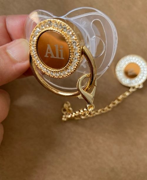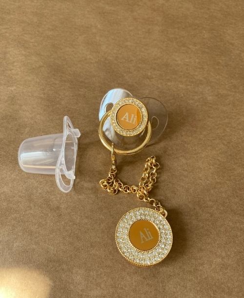 Emzik ve emzik zinciri zirkon taşlarla süslenmiştir