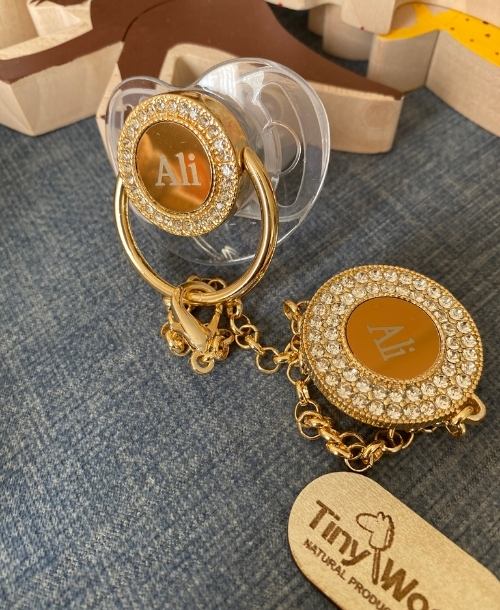Tiny Wood kalitesiyle hazırlanan İsme Özel Taşlı Emzik ve Emzik Zinciri Seti, hem şık hem de zarif bir bebek hediyesi arayanlar için mükemmel bir tercihtir.