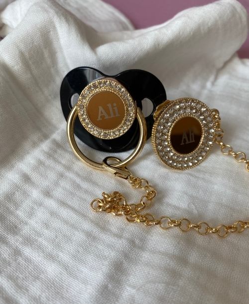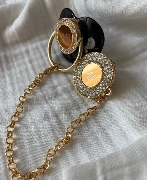 Emzik ve emzik zinciri zirkon taşlarla süslenmiştir