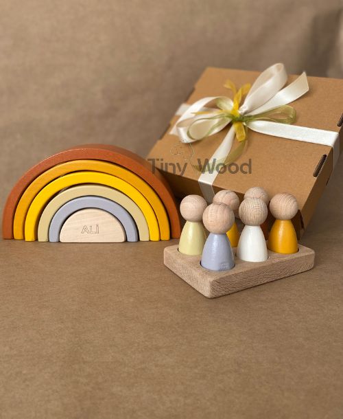 Set içeriğinde 6 parçalı pastel tonlarda Waldorf tarzı gökkuşağı, 6 adet pastel renkli peg bebek ve doğal ahşap tabla yer almaktadır.