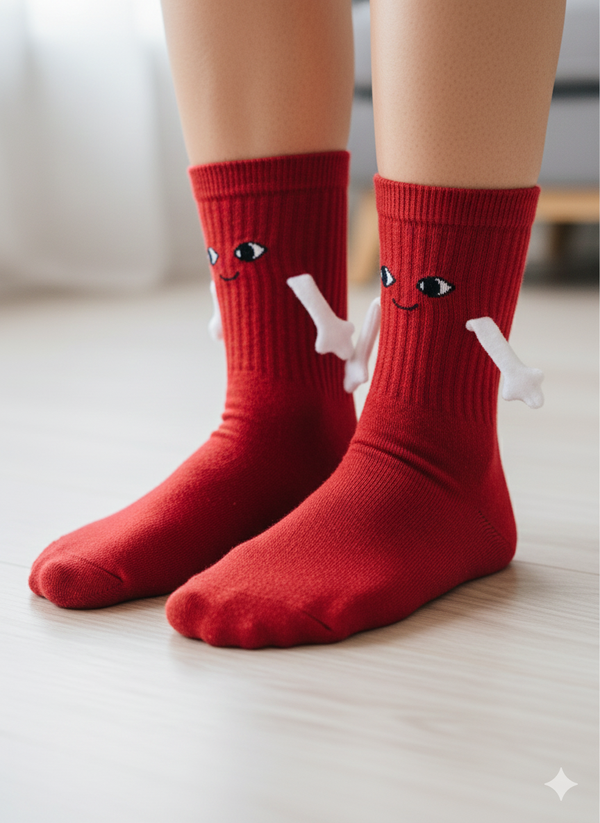 Bilek kısmındaki mıknatıslar sayesinde çoraplar birbirine “elele tutuşur” ve adeta halay çeken sevimli karakterler gibi görünür. Sosyal medya paylaşımlarında, hediye kutularında ve günlük kullanımda dikkat çeken eğlenceli bir aksesuardır.