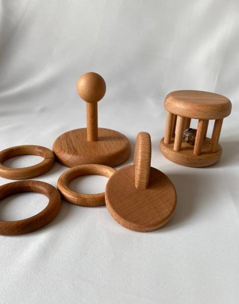 Tiny Wood Montessori Ahşap Oyun Seti, bebeklerin el-göz koordinasyonunu, kavrama becerilerini ve duyusal gelişimini desteklemek için tasarlanmış üç farklı doğal ahşap oyuncaktan oluşur.