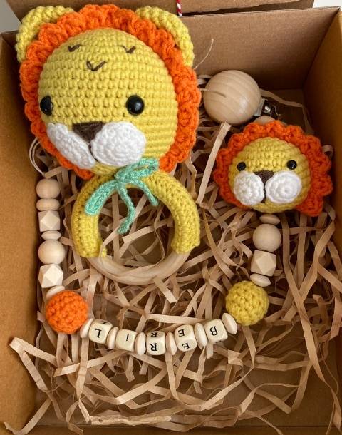 Setin içinde yer alan amigurumi aslan çıngırak ve kişiye özel isimli emzik zinciri, %100 pamuk iplik ve doğal kayın ağacından yapılmıştır.