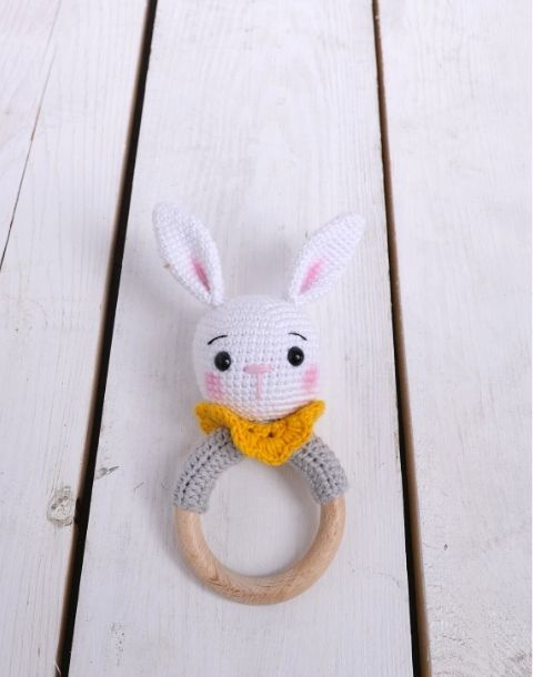 El örgüsü tavşan figürü %100 pamuk iplikle örülmüş, yüzeyi yumuşak ve hassas bebek cildine uygundur.