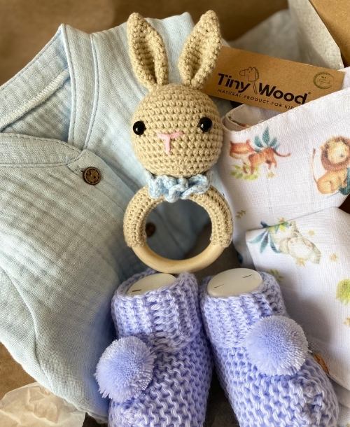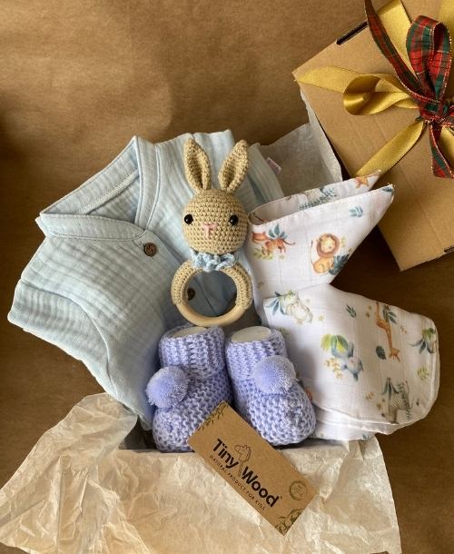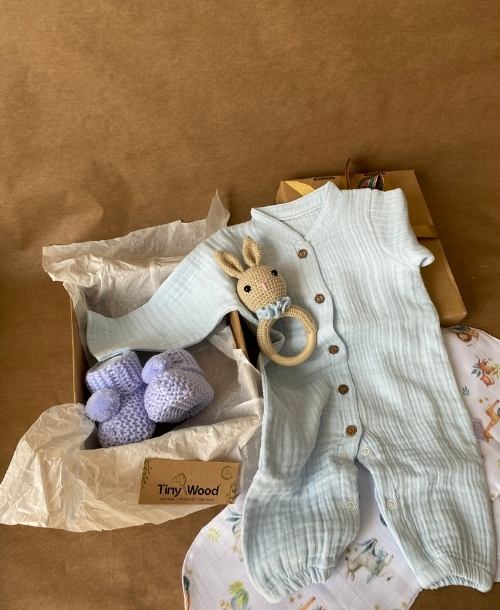 Tiny Wood\\\\\\\\'un doğallığı ve şıklığıyla hazırlanan Organik Bebek Hediye Seti, yenidoğan bebekler için özel ve sağlıklı bir hediye alternatifidir.