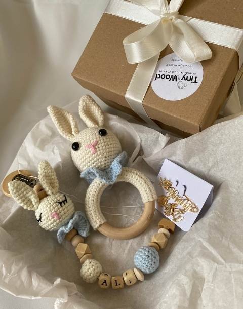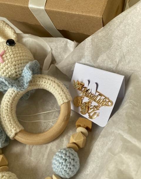 Ürün İçeriği: 1 adet organik tavşan modeli çıngırak, 1 adet bebek ismine özel hazırlanmış emzik zinciri, 1 Adet altın kaplama zirkon taşlı maşallah yaka iğnesi