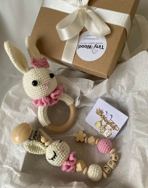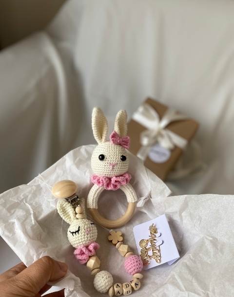Organik iplerle örülen amigurumi tavşan çıngırak, bebeğin adına özel emzik zinciri ve altın kaplama maşallah iğnesi, şık bir kraft hediye kutusunda özenle sunulur.