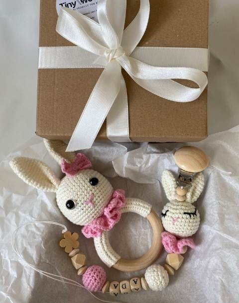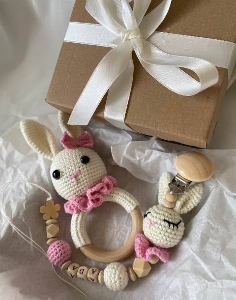 Organik pamuk iplerle örülen amigurumi tavşan çıngırak ve bebeğin adına özel emzik zinciri, doğal ahşap malzemelerle tamamlanarak şık bir kraft hediye kutusunda sunulur.