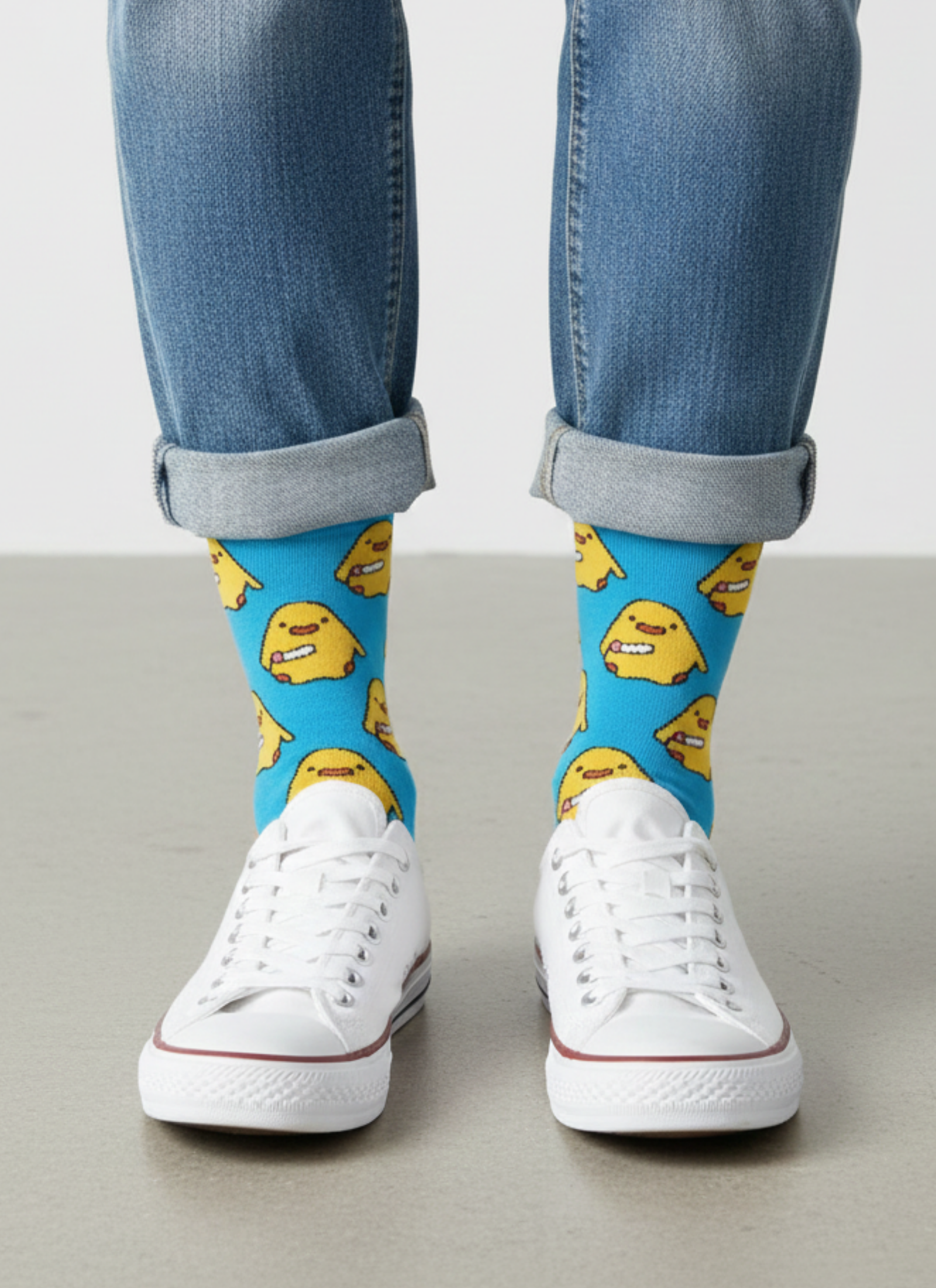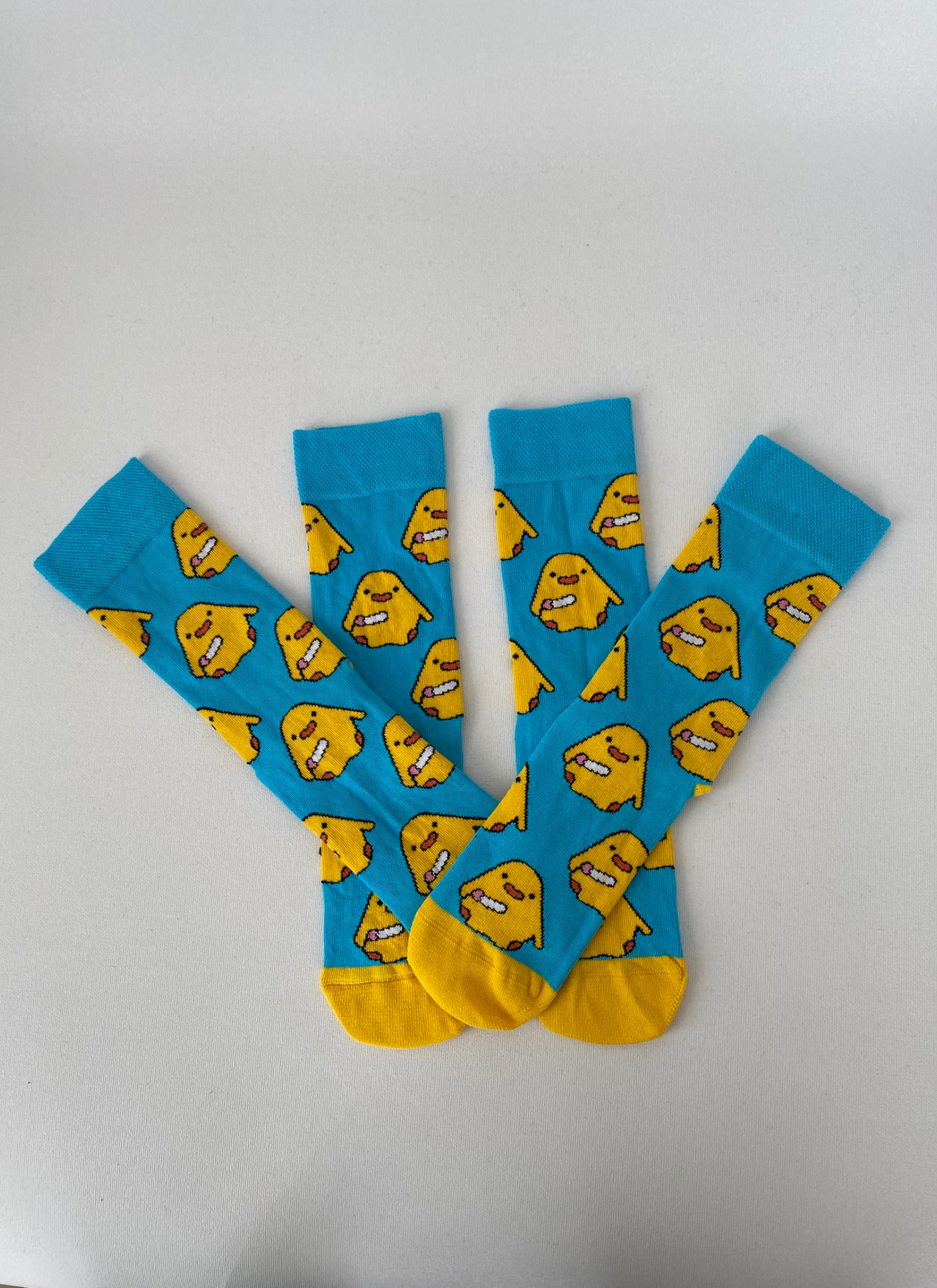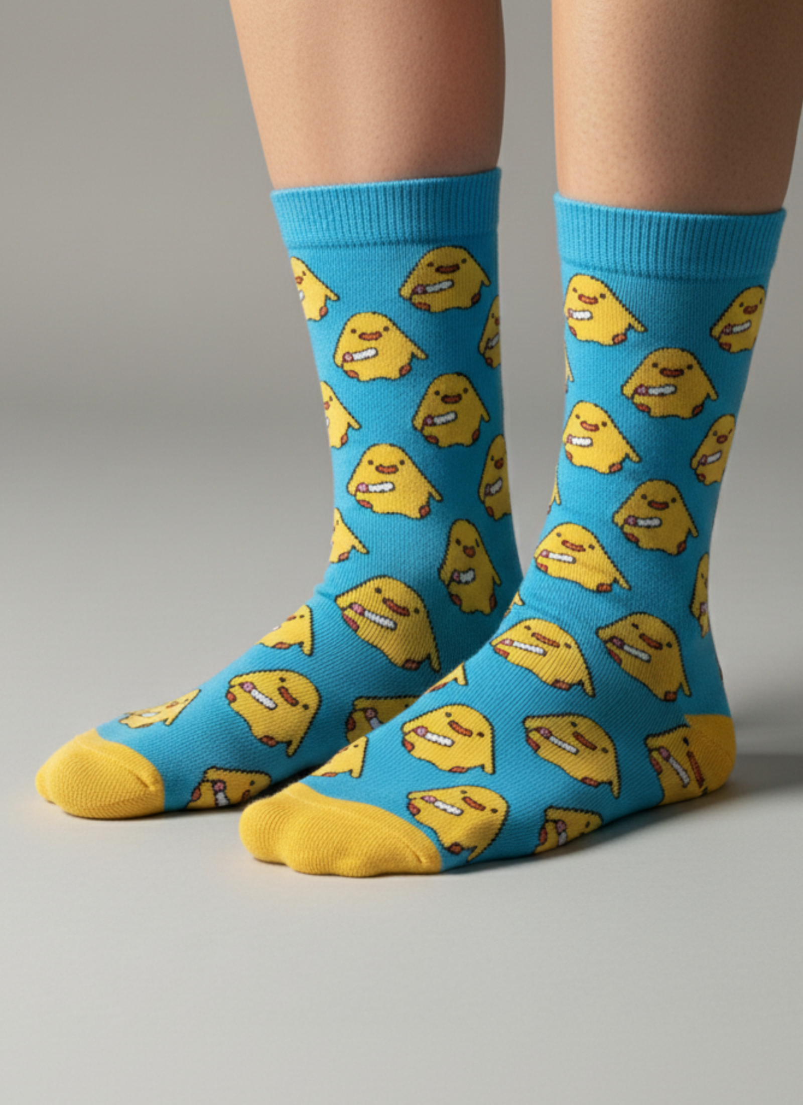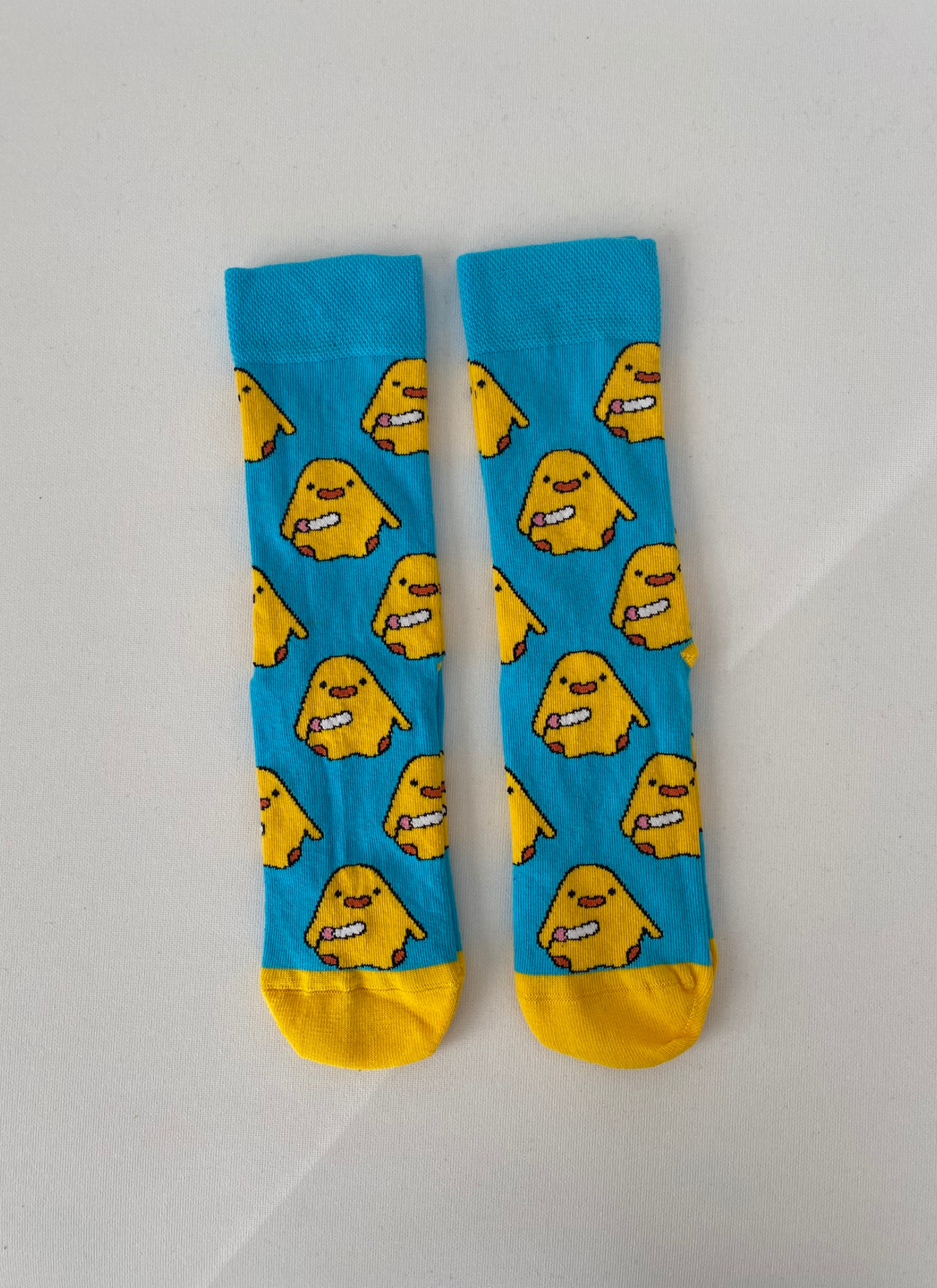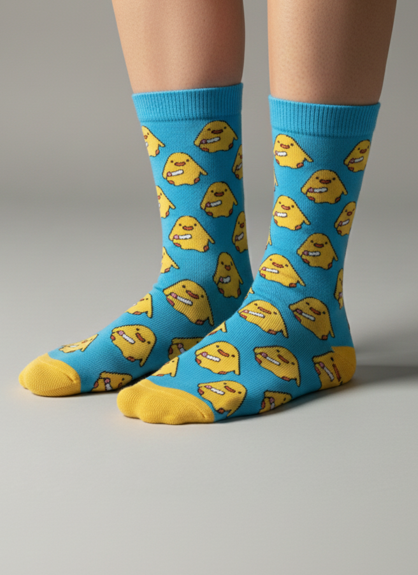 Mavi zemin üzerinde sarı civciv figürleriyle tasarlanan bu soket çorap, enerjik ve neşeli tarzıyla öne çıkar.