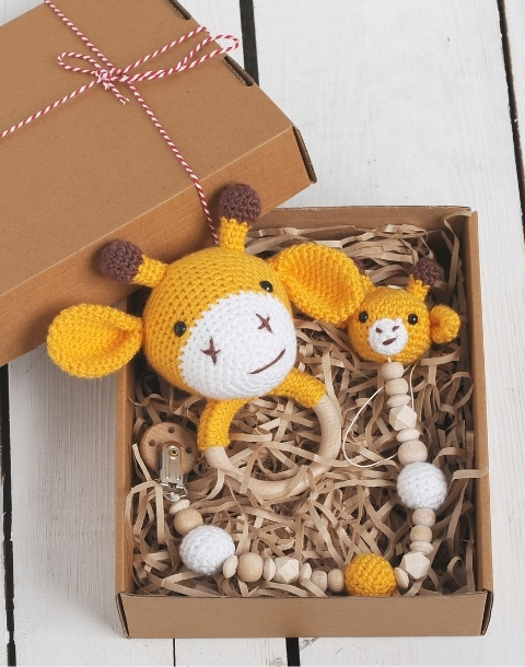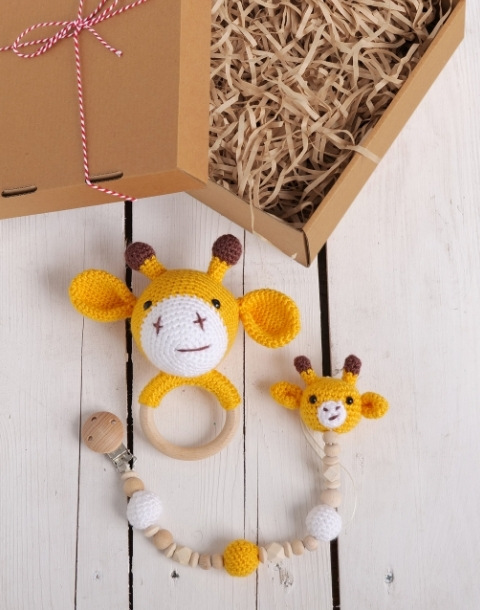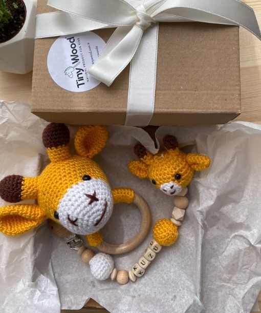 1 adet amigurumi zürafa çıngırak ve 1 adet kişiye özel isimli emzik zinciri.