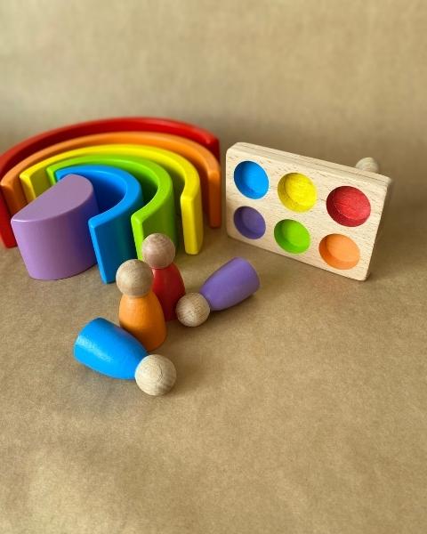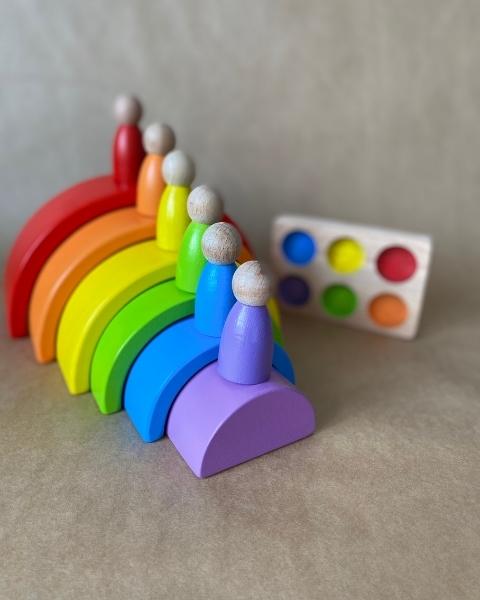 Waldorf 6 Parçalı Gökkuşağı 6’lı Peg Bebek Tabla Seti – Pastel Renk Eşleştirme Ahşap Oyuncak