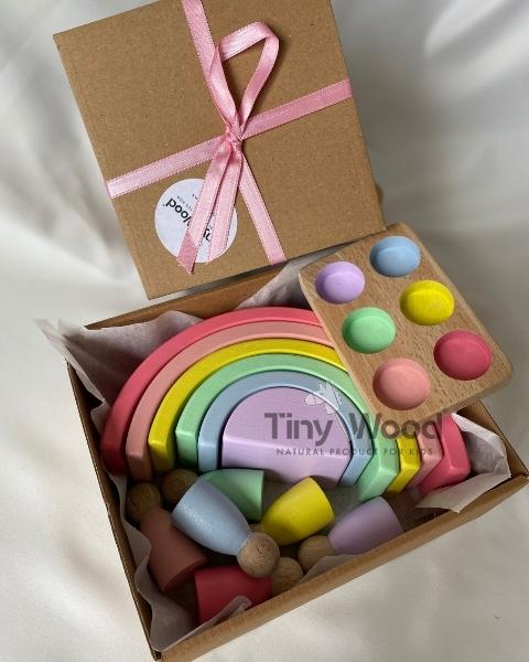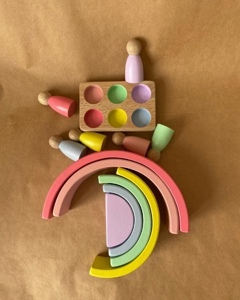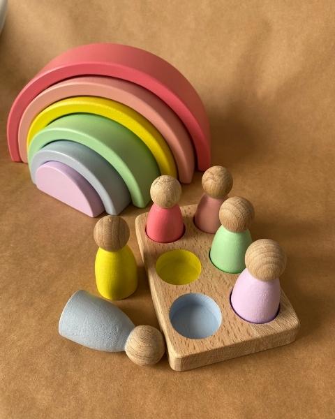 Waldorf 6 Parçalı Gökkuşağı 6’lı Peg Bebek Tabla Seti – Pembe Pastel Renk Eşleştirme Ahşap Oyuncak