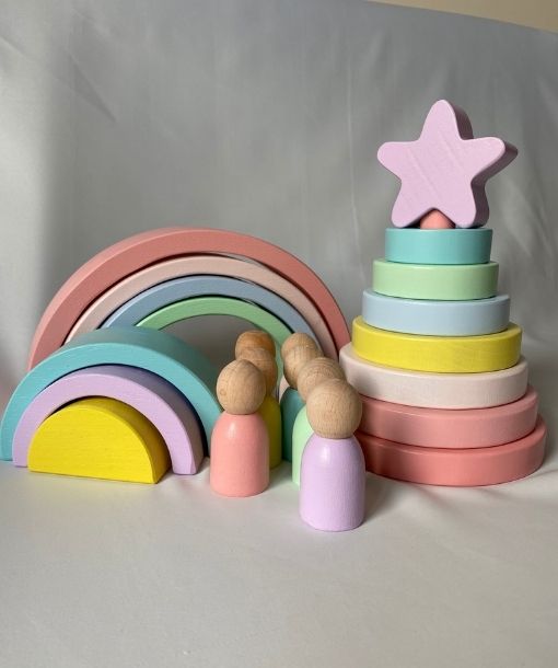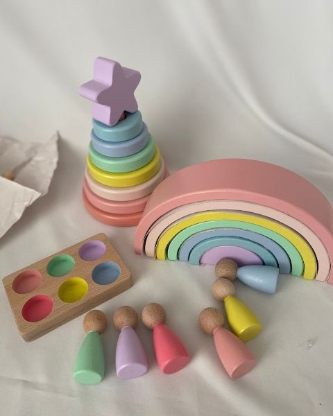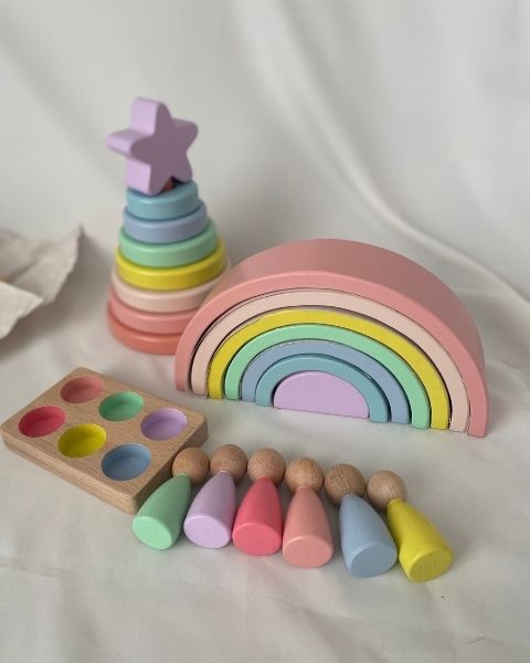 Waldorf Gökkuşağı, Peg Bebek Tabla ve Yıldız Hanoi Kule Seti; çocukların hayal gücünü, renk algısını ve motor becerilerini destekleyen açık uçlu bir Montessori oyuncak setidir.