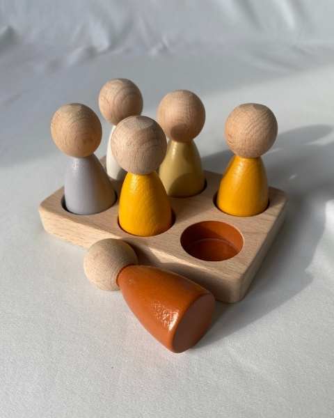 İçerik: 6 adet insan figürü peg bebek + 1 adet ahşap tabla