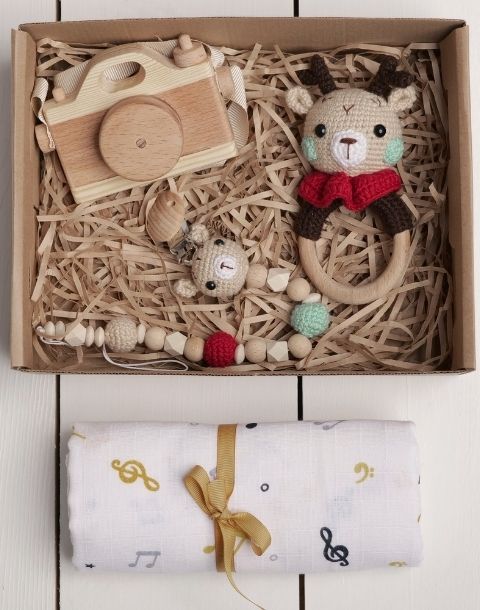 Yenidoğan Amigurumi Geyik Bebek Hediye Seti, tamamen el emeğiyle hazırlanmış özel bir hediye kutusudur.